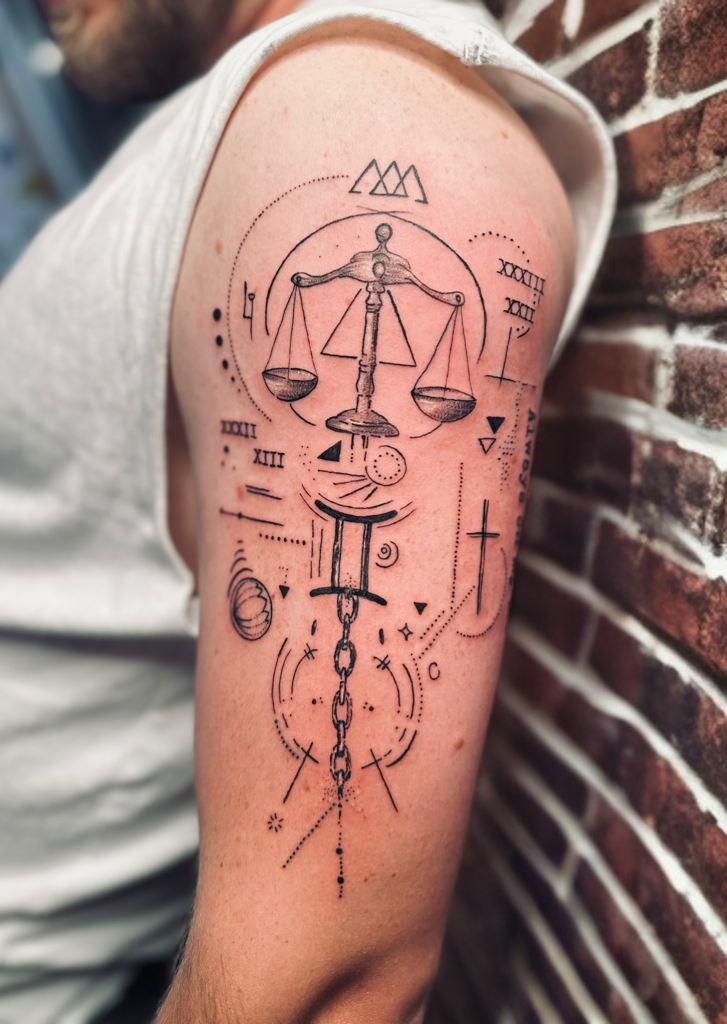 Tattoo auf dem Oberarm mit Waage, geometrischen Formen, römischen Ziffern und symbolischen Linien.