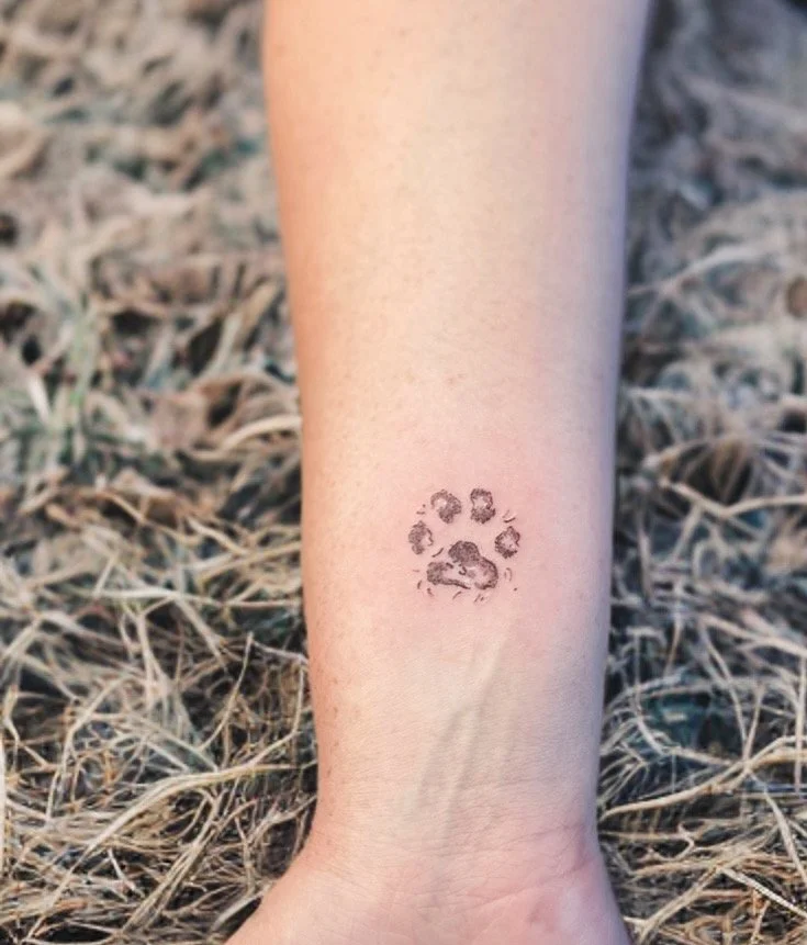 Tattoo eines Hundepfotenabdrucks auf dem Handgelenk, umgeben von trockenen Gräsern.