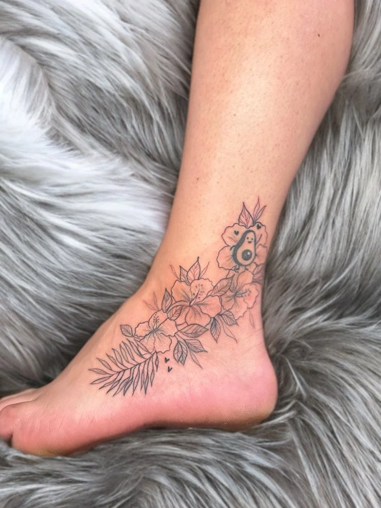 Tattoo eines Avocado- und Blumenmotivs auf dem Fuß, umgeben von Blättern, auf einem Fellhintergrund.