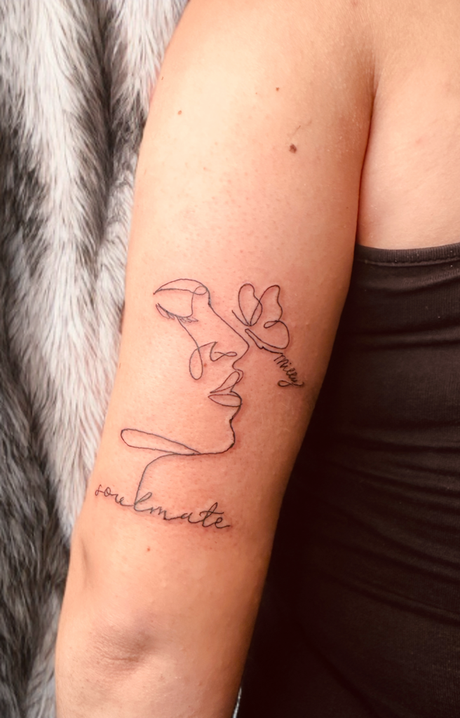Tattoo eines minimalistischen, linearen Portraits eines Paares mit den Wörtern "soulmate" und "unite" darunter am oberen Arm.