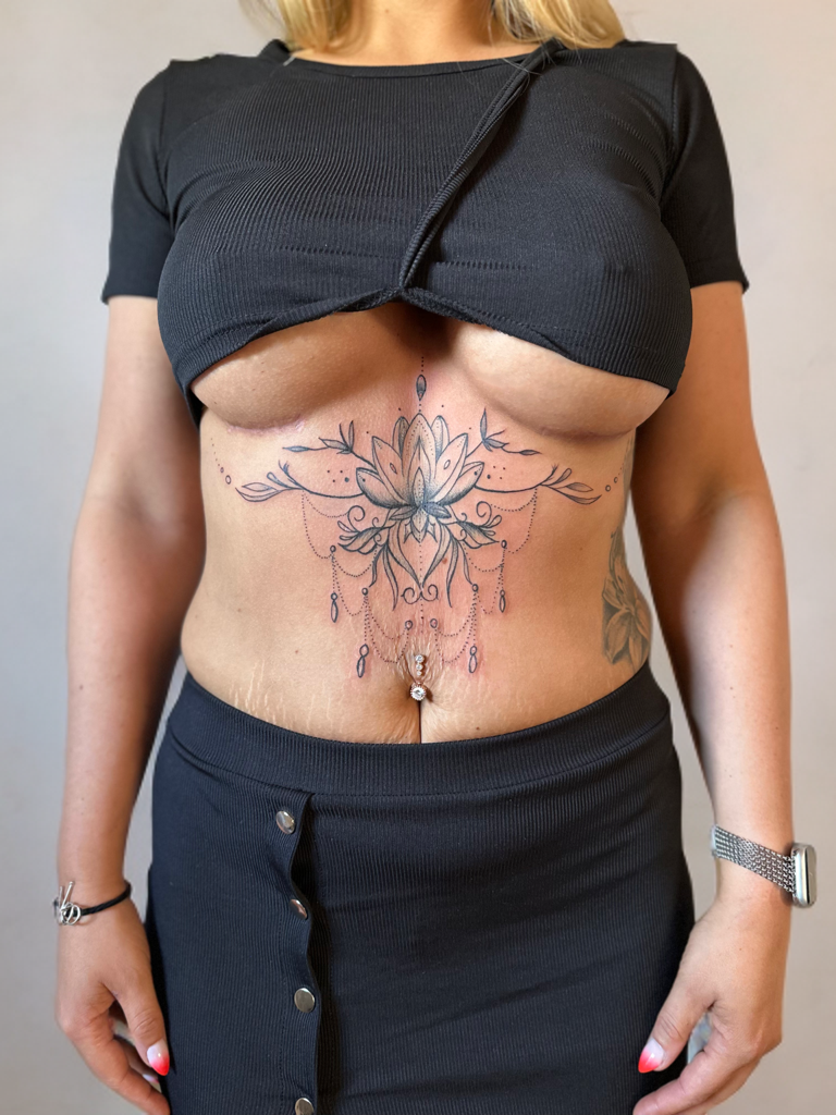 Nahaufnahme eines weiblichen Oberkörpers mit Tattoos, einem Nabelpiercing und einer schwarzen Oberbekleidung, die teilweise hochgezogen ist.